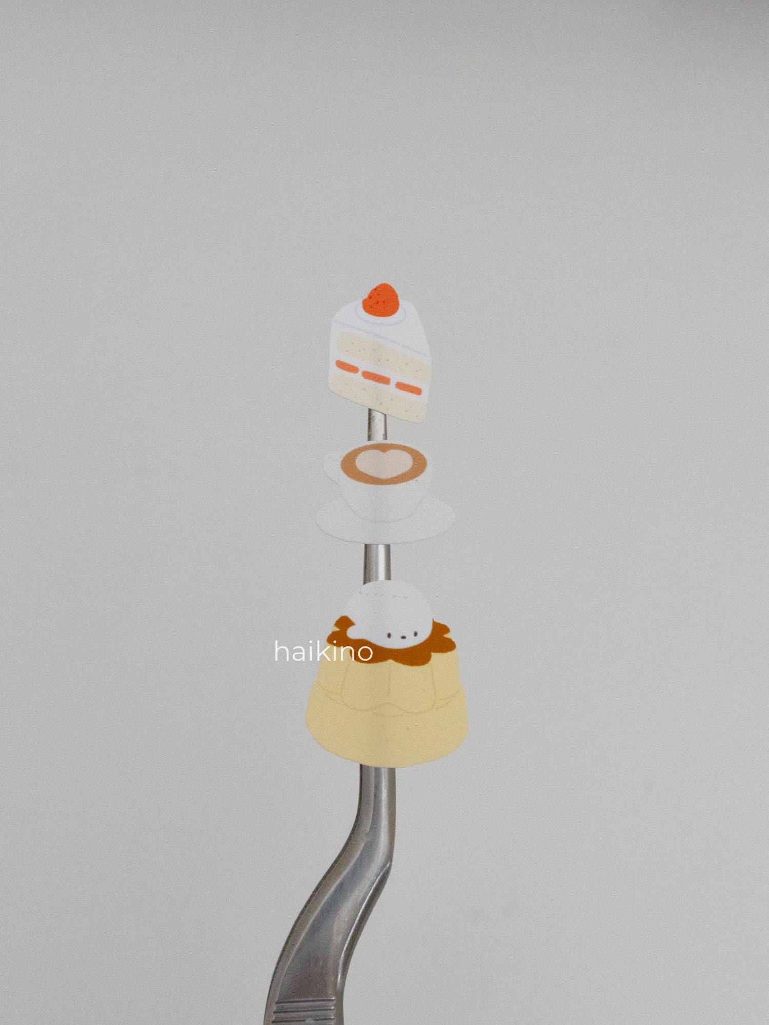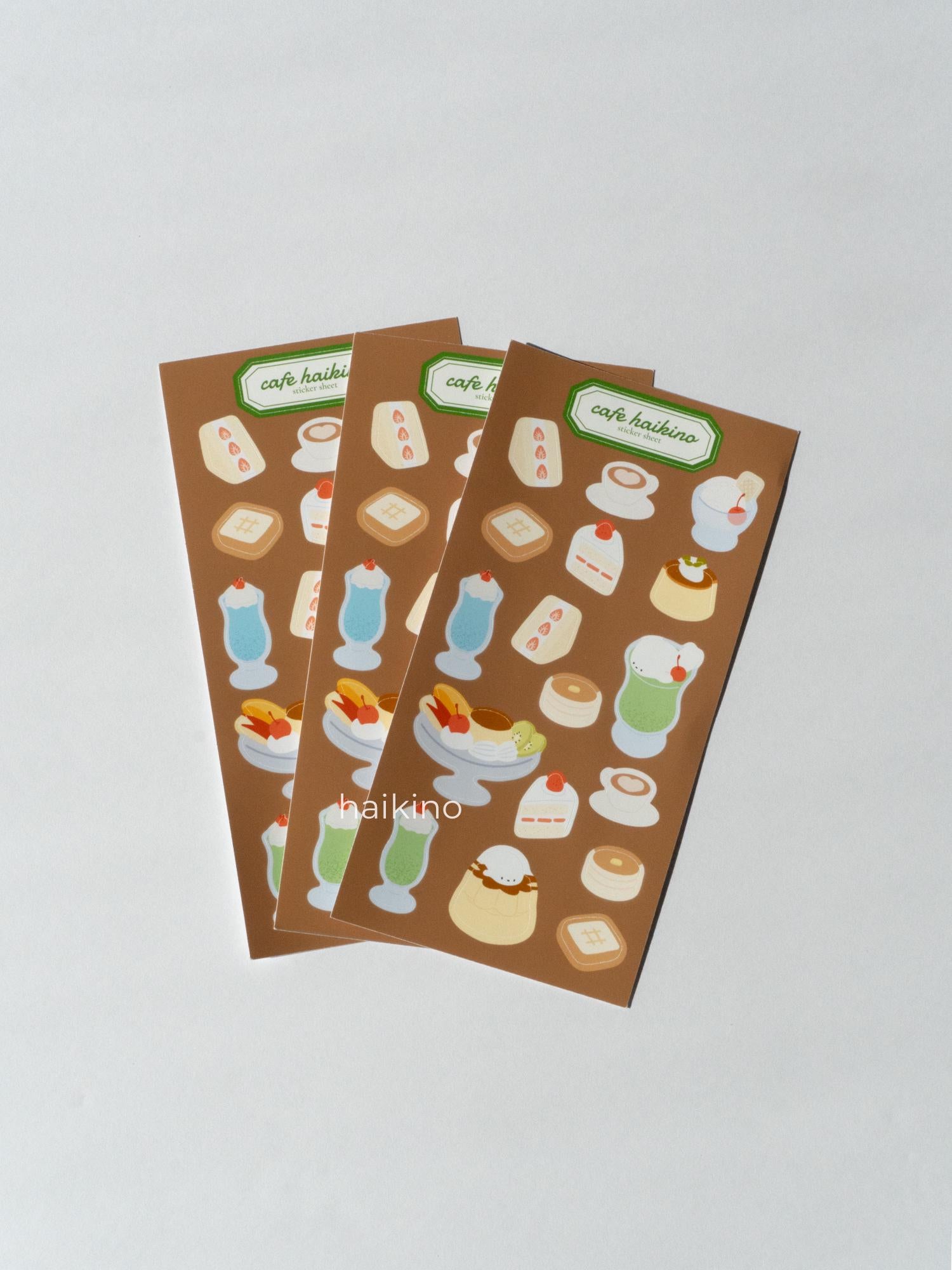 Travel to Cafe Haikino in this cozy sticker sheet features delicious retro cafe snacks featuring Kino the seal perched on food items like a melon soda and pudding
